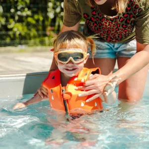 Het luchtdichte, waterdichte ontwerp zorgt voor optimaal comfort en veiligheid, terwijl de getinte lenzen de ogen beschermen tegen schittering van de zon. Dankzij de volledig verstelbare band past het masker perfect op het hoofd van je kind.