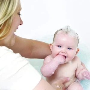 Knijp een ruime hoeveelheid zeep op een natte handpalm of washandje en laat het schuimen over het lichaam van je baby. Grondig afspoelen.