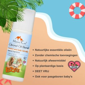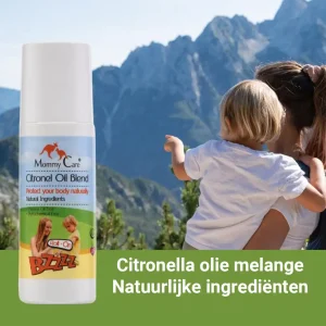 Prunus Amygdalus Dulcis (Zoete Amandel) Olie, Brassica Campestris (Canola) Zaadolie, Helianthus Annuus (Zonnebloem) Zaadolie, Ricinus Communis (Castor) Zaadolie, Pelargonium graveolens (Geranium) Olie, Tocopheryl Acetaat, Mentha Arvensis (Pepermunt) Kruidenolie, Rosmarinus Officinalis (Rozemarijn) Bladolie, Cymbopogon Schoenanthus (Citroengras) Olie, Lavandula Angustifolia (Lavendel) Olie, Cymbopogon Winterianus (Citronella) Olie, Citral, Citronellol, Geraniol, Limoneen, Linalool.