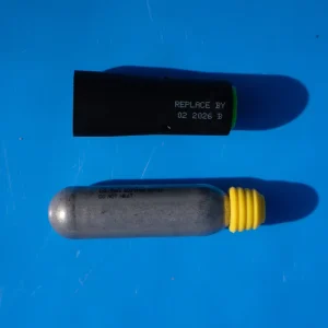 ◬ Het gaspatroon en de oplosbare detector die op het automatische opblaasmechanisme zijn geschroefd, zijn voor eenmalig gebruik. Als het anti-verdrink T-shirt is opgeblazen, moeten het patroon en de detector worden vervangen.
