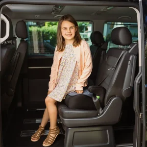 De stijlvolle zitverhoger is eenvoudig te bevestigen met de 3-puntsgordel en biedt het kind een veilige zit.
